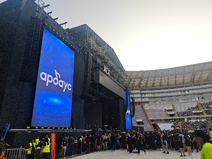A large outdoor stage dominates the view, featuring a digital screen displaying "apdaus" in white letters over a blue backdrop