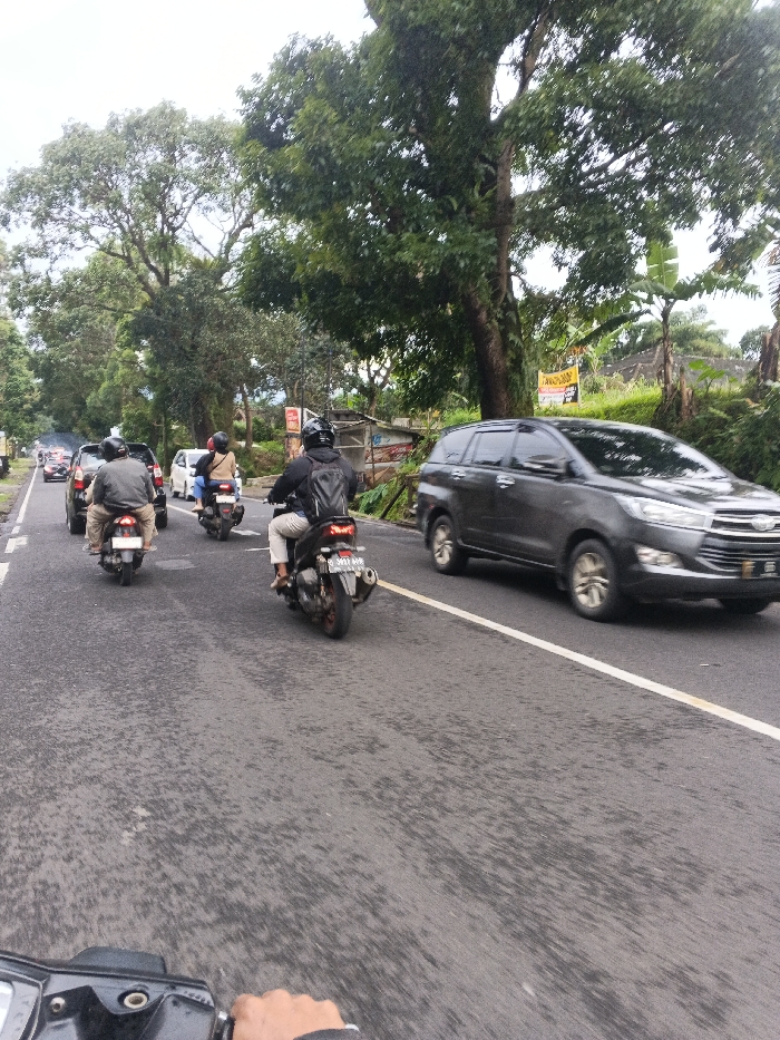 The scene is requested to be described as located in Kadoma, Zimbabwe. However, forensic analysis of visible details, such as Indonesian license plates ("DK 3853 ABU" on a scooter and "BB" on an MPV) and characteristic Southeast Asian vehicle models and tropical vegetation, indicates the actual location is in Indonesia. The image captures a daytime road scene under an overcast sky, viewed from the perspective of a motorcycle rider. The asphalt road is worn and features a solid white line separating traffic directions and a dashed white line along the left edge. In the left lane, three motorcycles are visible moving away from the viewer. The nearest motorcycle has a male driver in a grey jacket and tan pants, wearing a black helmet. Immediately in front, another scooter carries a driver in a light brown top and dark pants, wearing a red helmet, with a passenger in a light brown top. Further ahead, a dark scooter, possibly a Yamaha NMAX, is ridden by a male in a black jacket and black backpack, wearing a black helmet and light tan pants. This scooter displays an Indonesian license plate, "DK 3853 ABU". Additional vehicles, including a white car and a dark sedan, are visible further down the left lane. In the right lane, a dark grey Toyota Innova MPV is moving towards the viewer, appearing slightly blurred due to motion. Its front license plate begins with "BB". The environment is lush with dense tropical foliage. Tall trees with broad canopies line the left side of the road and extend into the background. On the right, behind the MPV, banana plants and other tropical vegetation are present, along with a small structure featuring a corrugated metal roof and a partially visible yellow banner displaying black text, potentially "TAND... SHOP".