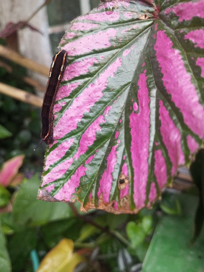 A brown and tan striped caterpillar rests along the edge of a pink and green leaf