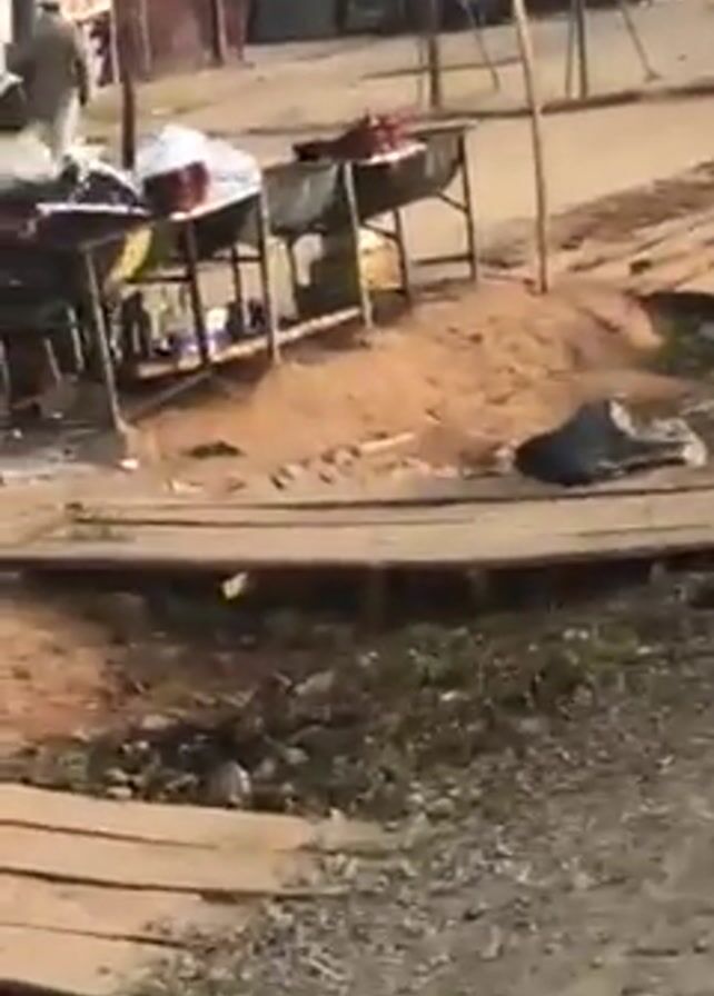 n outdoor scene with a person sitting at a table in the background, possibly selling food or goods. There are several tables and makeshift structures nearby. A wooden plank bridge crosses over a dirt ditch in the foreground. The ground is dirt and there is some trash visible. A sign is in the background with some text on it.