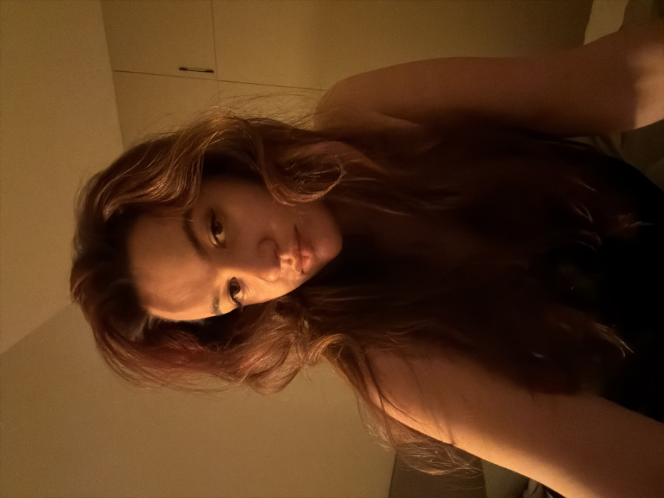 A woman with long, wavy brunette hair gazes into the camera. Her head is tilted to the left, creating a slightly coy expression. The lighting is warm and somewhat dim, casting soft shadows across her face and highlighting her features. The background consists of light-colored walls and a glimpse of closed cabinets. Her shoulders are visible, suggesting she may be wearing a dark-colored top. The overall mood is intimate and relaxed.