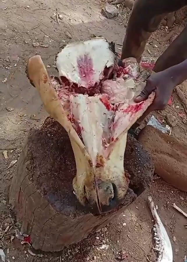 Here is a concise description of the video. A person is butchering a cow's head on a tree stump outside on the ground. The head has already been split open and the person is using a piece of wood to further separate the parts. A jawbone lays on the ground nearby.