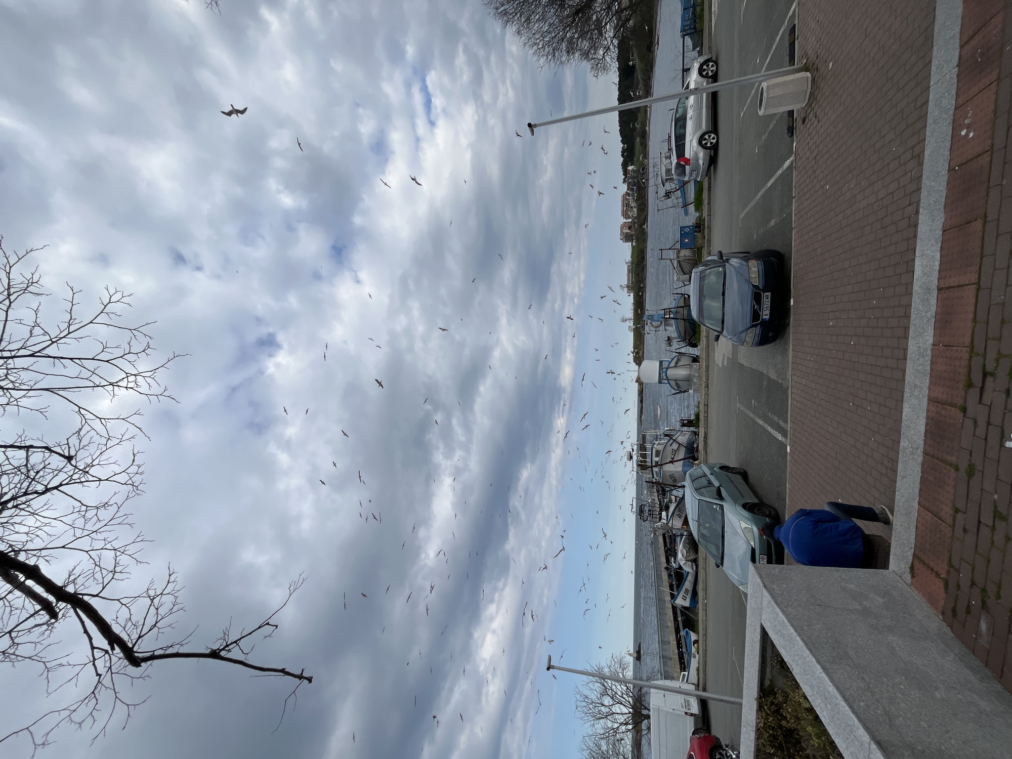 The scene is Ahtopol, Bulgaria. A gray-bricked walkway is on the right, next to a parking area with cars. A blue car with license plate "S 5672 AK" is parked. Across the parking area is water with many small boats docked. Hundreds of birds are flying in the sky. Bare tree branches are on the bottom left. A person wearing a blue jacket and black pants is visible in the bottom right of the image.