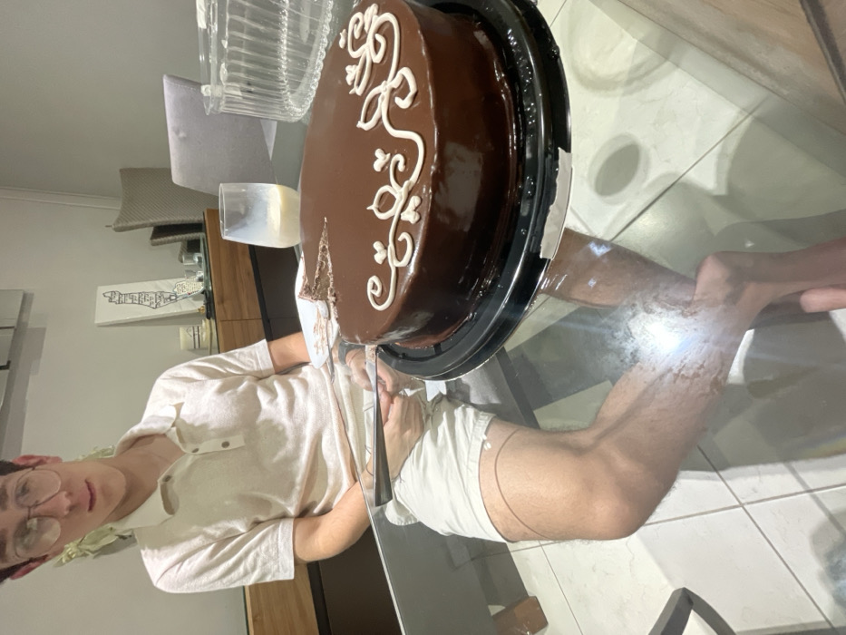 The scene depicts an indoor residential setting in Acatlipa, Mexico, likely a dining area. A young adult male, wearing clear-framed glasses, a light-colored polo shirt, and light-colored shorts, is seated at a clear glass table, facing the camera. His hands are clasped on the table, and his left leg and bare foot are visible beneath the table, reflecting on its surface. In the foreground on the glass table, a large, round chocolate cake with a smooth, glossy dark brown frosting is presented on a black plastic base. White decorative piping, featuring swirls and heart-like motifs, adorns the top surface of the cake. A triangular slice has been cut and removed from the cake, and a metallic cake serving tool is positioned next to the cut section. A plate holding a portion of cake and some crumbs is visible behind the main cake. To the right of the cake, a clear glass holds a light-colored liquid, and a large, clear, fluted glass bowl or lid is also present. The background features a wooden cabinet or buffet with various decorative items, including a tall, rectangular white object with a black line drawing. Two upholstered chairs are partially visible behind the table. The floor is composed of light-colored square tiles.