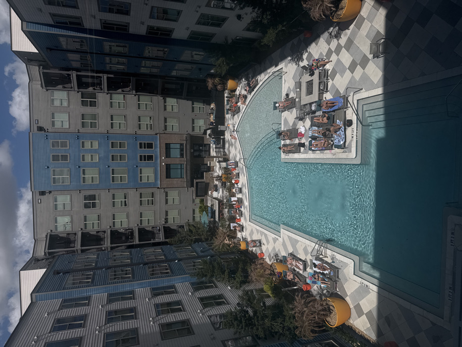The image displays an aerial perspective of a residential courtyard within a modern apartment complex located in Gainesville, United States of America. Multi-story buildings, featuring grey and blue horizontal siding and numerous windows, enclose the central amenity space. The sky is partly cloudy with visible blue patches, indicating a bright, sunny day with distinct shadows cast across the scene. The courtyard's primary feature is a large, irregularly shaped swimming pool filled with clear blue water. The pool perimeter is surrounded by a paved deck exhibiting a light and dark grey checkered pattern. Approximately 30 to 40 individuals are observed throughout the area. The majority are reclining on dark-colored lounge chairs, engaged in sunbathing or relaxation, dressed in swimwear. A few individuals are present within the shallow section of the pool. Additional elements within the courtyard include several small tables with accompanying chairs, one outdoor fire pit seating arrangement, and large, vibrant orange/yellow cylindrical pots containing various plants, including palm-like and coniferous trees. Personal items such as towels, beverages, and bags are visible on or adjacent to the lounge chairs. A building entrance or clubhouse structure is situated at the far end of the courtyard.