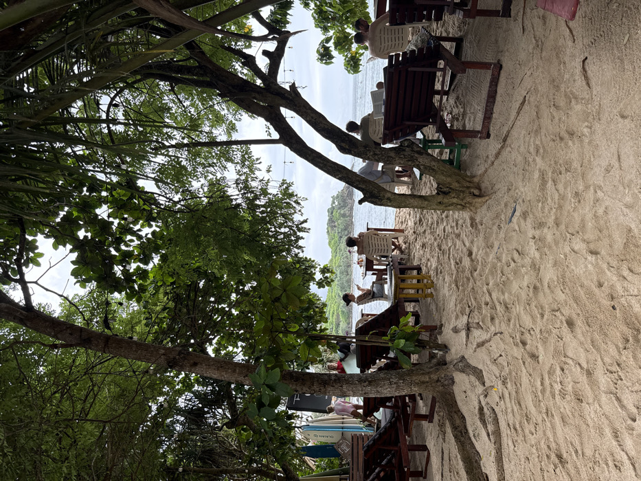 Underneath a tree canopy, a sandy beach scene unfolds. Several people sit at tables and chairs, enjoying the view of the ocean in the distance. The tables and chairs are basic, and some have colorful accents. The composition is partially obscured by tree branches and foliage, giving the impression of viewing the scene from a hidden spot.
