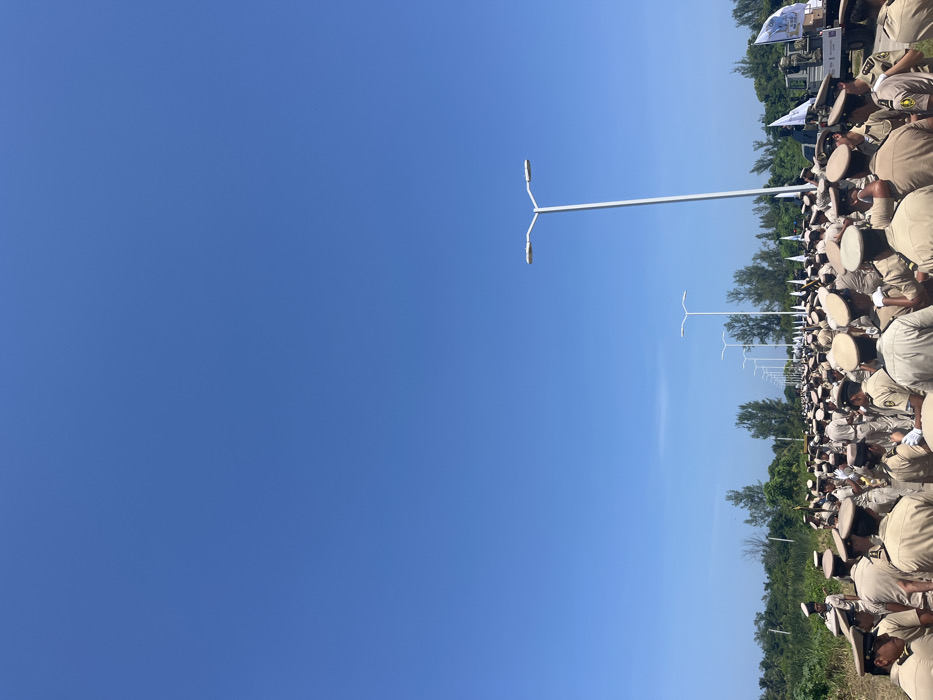 A large formation of several hundred individuals, uniformly dressed in light tan or beige uniforms with matching caps, occupies the foreground and mid-ground of an outdoor scene in Antón Lizardo, Mexico. The personnel are positioned on a flat, open area, likely a road or parade ground, under a clear, cloudless blue sky, indicative of bright daylight conditions. A long row of modern white streetlights, each featuring a double-arm fixture, recedes into the distance along the right side of the area. Scattered white flags or banners with blue insignias are visible further down the line of personnel, with one banner partially displaying the word "Fuerzas" attached to a utility truck on the far right. The immediate surroundings consist of dry, sparse vegetation on the left and dense green trees and brush lining both sides of the gathering area, extending into the background. No explicit actions or interactions are clearly depicted among the tightly packed individuals.