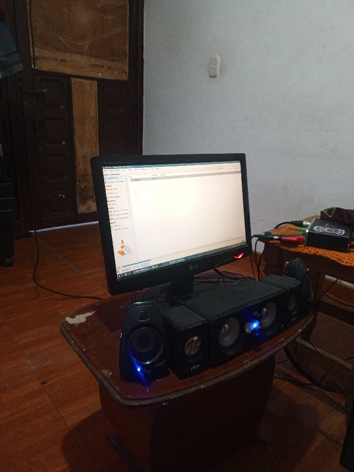 A computer monitor sits atop a 2.1 speaker system on a small, stained wooden table. The monitor, likely an LG brand, displays a VLC media player interface. The speaker system features five speakers, the front three centered and each flanking side with one additional speaker. A secondary wooden table is visible to the right, displaying an audio interface with cables. The background includes a cream-colored wall, wooden floors, and a partially visible wooden door or wardrobe. A light switch can be seen near the upper right corner of the scene.