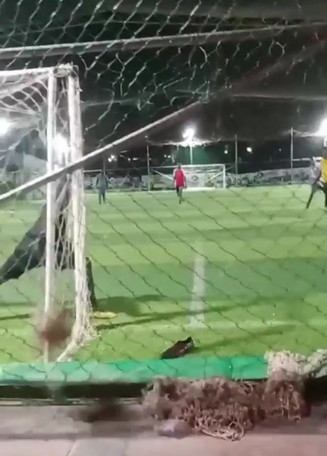 The scene shows a person scoring a goal in a futsal game. The camera is positioned behind the net, providing a view of the artificial turf field. Several people are visible in the background. The field is lit by overhead lights. The person scoring is wearing dark clothing, while others are wearing red and yellow. The ball goes into the net, and the person scoring raises their arms. There is some rope or netting on the ground in front of the camera.