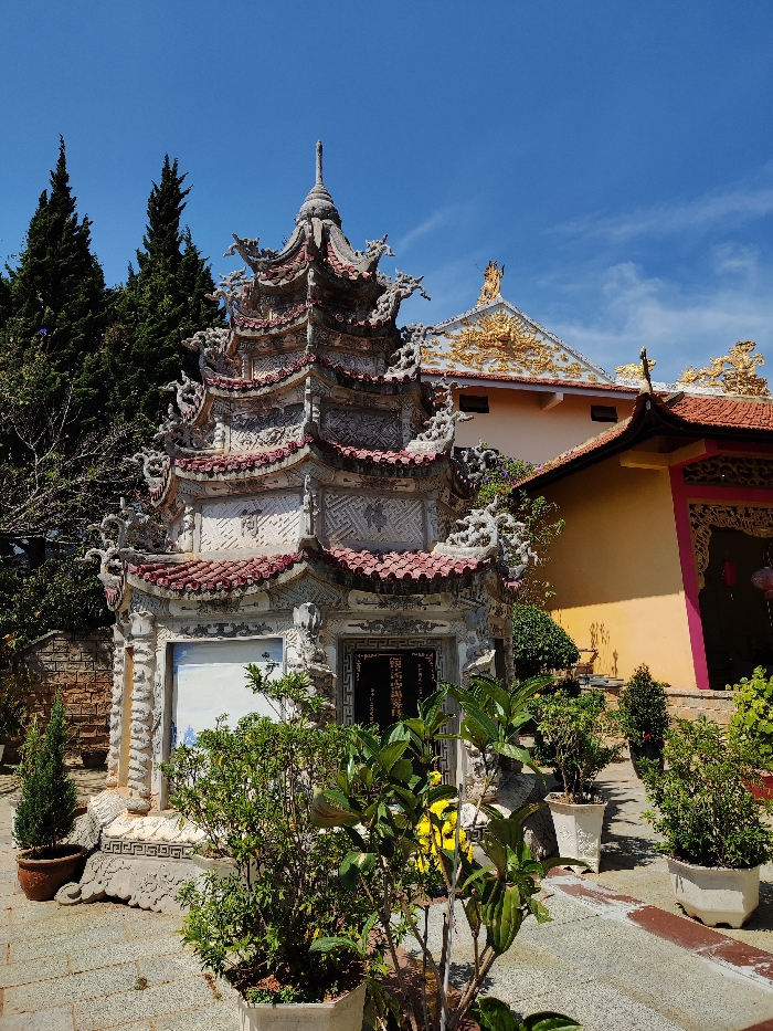 A multi-tiered ornate Asian structure with intricate carvings stands in a courtyard, possibly a shrine or mausoleum. It has red-tiled roofs and light-colored stone walls. Lush green plants in pots surround the base. Behind it, part of another building is visible, featuring a gold-decorated roofline and a yellow wall with red accents. Tall trees provide a backdrop against a bright blue sky with scattered clouds.