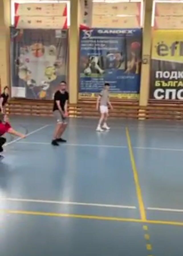 group of about eight people playing volleyball indoors on a blue court with yellow lines. They appear to be evenly divided on either side of the net. The people are wearing athletic clothing. The court is inside a gymnasium or school building with yellow support beams and sponsor banners along the upper walls. There are bleachers on one side of the court. The video follows the volleyball as it goes back and forth between the teams.
