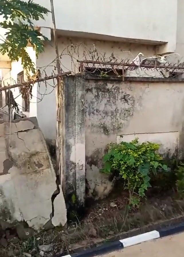 weathered, cracked concrete wall with barbed wire running along the top. A damaged concrete structure, possibly stairs, is partially collapsed next to the wall. A papaya tree with several fruits is behind the wall. The area appears overgrown with vegetation. There is an asphalt road or walkway with a black and white striped curb in the foreground. The building behind the wall is white and appears to be in a state of disrepair. Someone exclaims "Oh my God" three times in response to the view.