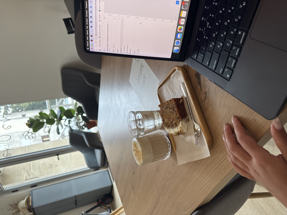 An indoor scene depicts a modern cafe or co-working space located in Budva, Montenegro, identifiable by contextual clues and visible text elements like "OPTOME ONE". The primary subject is a light wood-grain table where a dark-colored laptop, open and displaying design software (Figma) in a Chrome browser, is positioned on the right. The laptop features a keyboard with both Latin and Cyrillic characters. A person's right hand with manicured nails rests on the table beside the laptop. To the left of the laptop, a ribbed glass contains a light-colored, foamy beverage (likely a latte or cappuccino), accompanied by a clear glass of water. A slice of carrot cake with white frosting is presented on a small wooden rectangular tray with a silver fork, resting on white parchment paper. A white document or menu, partially visible, displays the text "OPTOME ONE". In the background, large glass windows reveal an urban street view, including green foliage, parts of buildings, and a metal railing. Interior elements visible through and beyond the window include several dark grey upholstered armchairs, a tall potted green plant, and a two-part grey storage cabinet topped with a straw hat, with a scooter or similar wheeled object leaning against it on the far left. The reflection on the window includes fragmented text, possibly "Olio Vg". The scene suggests an individual working remotely or studying while enjoying refreshments.