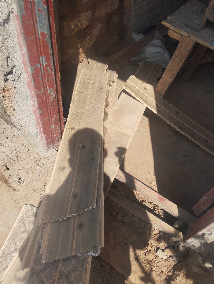 The scene is an outdoor or semi-enclosed ground-level area in the city of Idon, Nigeria, characterized by disturbed earth and construction materials under direct sunlight. A vertical, red-painted metal frame, exhibiting areas of peeling paint and rust, borders the left side of the frame, partially embedded in sandy, reddish-brown earth. Adjacent to this frame, the ground slopes downwards into a depression or excavated section. Within this lower area, a rudimentary wooden support structure is visible, constructed from rough-hewn timber. A white sack is partially discernible in the background, near the base of this structure. In the foreground and extending into the midground, a stack of weathered, light-colored wooden planks, some displaying a patterned underside, rests on the uneven ground. Two distinct human shadows are cast from the left onto the ground and across the wooden planks; one large shadow in the foreground suggests an individual holding a device, while a smaller, less defined shadow is present further back. The ground throughout consists of loose, reddish-brown soil, sand, and scattered small rocks.