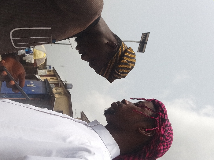 Two adult males are observed in an outdoor urban setting within Iganmu, Nigeria, under a cloudy sky