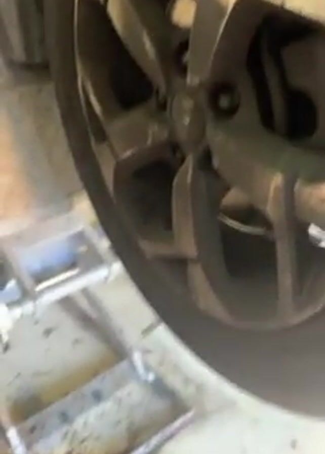 close-up of a car wheel, which is dirty, with a grey rim, secured on a lift in a garage. The wheel has a complex spoke design, and the central hub is visible. Behind the wheel, the brake rotor and caliper are noticeable. The lift mechanism is partially visible at the bottom left, and the floor appears to be concrete. The lighting is somewhat diffused.