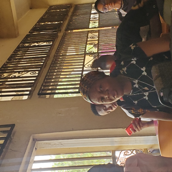 The image depicts a group of people indoors. A woman in a headscarf, floral print dress, and necklace looks directly at the camera, holding a red phone. Behind her is another young person. Above, partially obscured, is a person wearing glasses. Windows with metal security bars are visible, allowing daylight to stream in. The room has a neutral tone.