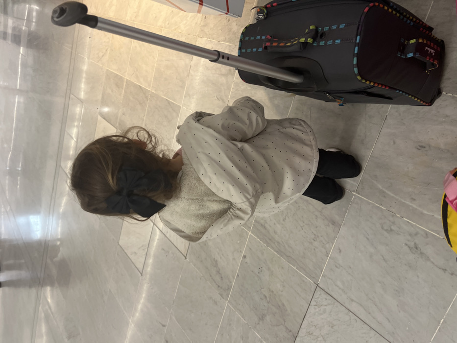 A young child with a dark bow in their hair stands near a suitcase with an extended handle. They wear a light-colored jacket with dark polka dots and dark-colored leggings or pants. The surface is a light gray marbled tile floor, common in airport or commercial settings. A small portion of another colorful bag is visible in the lower right corner.