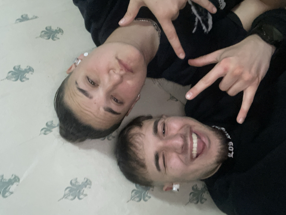 The image displays two individuals positioned closely together in an indoor setting. The background consists of a light-colored wall adorned with a repeating pattern of stylized blue-green fleur-de-lis motifs, suggesting wallpaper. The indoor setting lacks any specific visual identifiers to determine a precise location within the city of Plovdiv, Bulgaria. On the left, a young male with short dark hair, bangs, and faded sides, exhibits a wide smile, a wink of his left eye, and a slightly protruding tongue. He has stubble on his chin and a gauge earring in his left ear. He is wearing a black long-sleeved shirt with the word "LOS ANGELES" inscribed in white script around the collar. His right hand is raised, forming a "rock on" gesture with the index finger and pinky extended. On the right, slightly behind and above the first individual, is another young person with short, dark hair styled into a top knot with shaved sides. This individual wears a white circular stud earring and a smaller stud in the upper right ear cartilage, along with a silver-colored chain necklace and a black t-shirt featuring a faint white graphic on the chest. Their expression is neutral, with eyes directed towards the camera. Their left hand is raised, with two fingers (index and middle) pointing downwards.