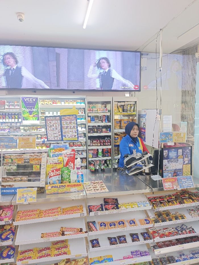 This image captures the interior of a brightly lit convenience store, located in Kecamatan Pati, Indonesia