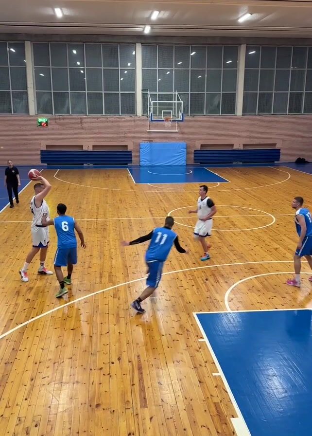 basketball game in progress. The scene is indoors in a gymnasium with a wooden basketball court featuring blue painted areas. There are people in basketball uniforms. Some uniforms are white with black trim and numbers, others are blue with black trim and numbers. Players are actively moving, dribbling and passing the basketball. One player in a white uniform shoots the basketball towards the hoop. A scoreboard is visible on the wall, displaying numbers. There are spectators sitting on benches in the background. An individual in dark clothing stands on the sidelines, possibly a coach or referee. The camera is positioned at an elevated angle capturing the action on the court.