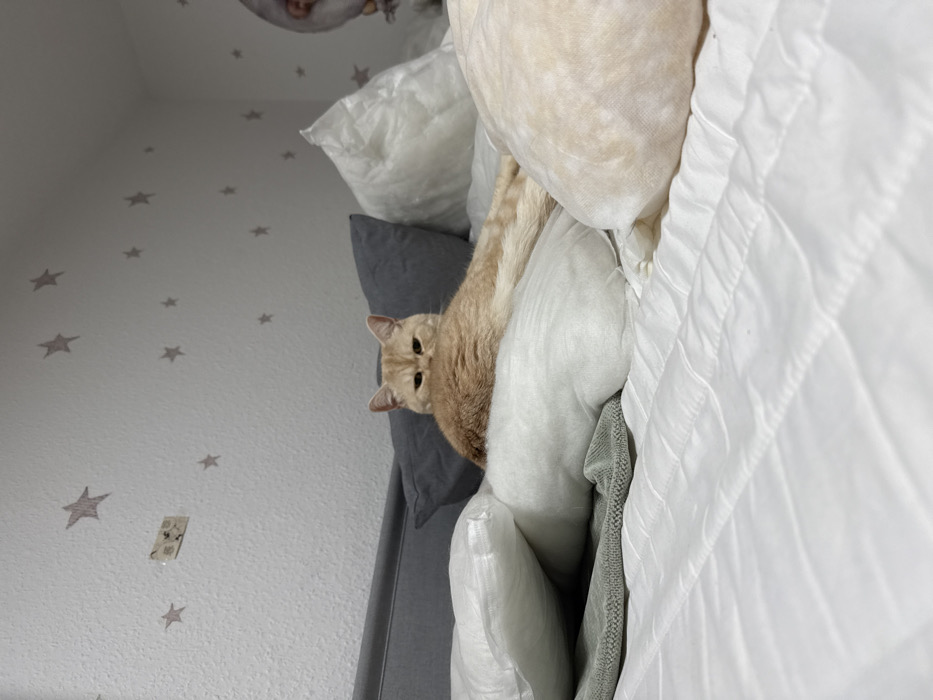 - "An orange tabby cat peeks out from a pile of pillows" by FM-Mispt2, licensed under CC BY 4.0