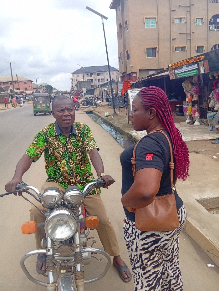 An adult male on a motorcycle is engaged in conversation with an adult female standing beside him on a paved street in Umuode, Nigeria