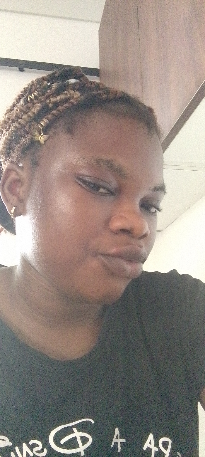 The image depicts an individual, identified as female, positioned indoors in Alaguntan, Nigeria