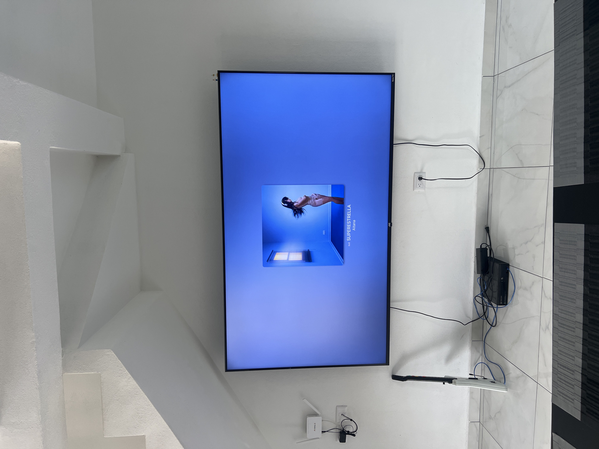 The scene depicts an interior room in the city of Cholula, Mexico. The environment features white walls and a light-colored tiled floor with dark grout lines. A section of a dark-colored rug with horizontal grey stripes is visible in the foreground. Overhead, white architectural elements suggest a staircase or angled ceiling structure. A large, black-bezeled flat-screen JVC Roku TV is wall-mounted centrally. The screen displays a light blue interface with a prominent album cover image in the upper right quadrant. The album cover features a woman with long, dark hair, wearing headphones and a light-colored two-piece outfit (possibly pink or beige top and shorts), standing in a minimalist room with a window. Visible text below the album cover identifies the track as "...SUPERESTRELLA" by "Aitana." Below the television, a black Xbox gaming console rests on the tiled floor, surrounded by a tangle of black power cables and blue Ethernet cables. A black power adapter is also on the floor nearby. To the left of the Xbox, a white video game controller shaped like an electric guitar leans vertically against the wall, connected by a blue cable to the Xbox. To the right of the Xbox, a white electrical outlet with two receptacles is visible on the wall, with a black power cord plugged into it and extending upwards behind the television. To the upper left of the television, a white Wi-Fi router with two antennas is mounted on the wall. Below it, a smaller black device, likely a network component or power strip, is also wall-mounted, with various black cables connected and trailing downwards. No individuals are present in the immediate scene.