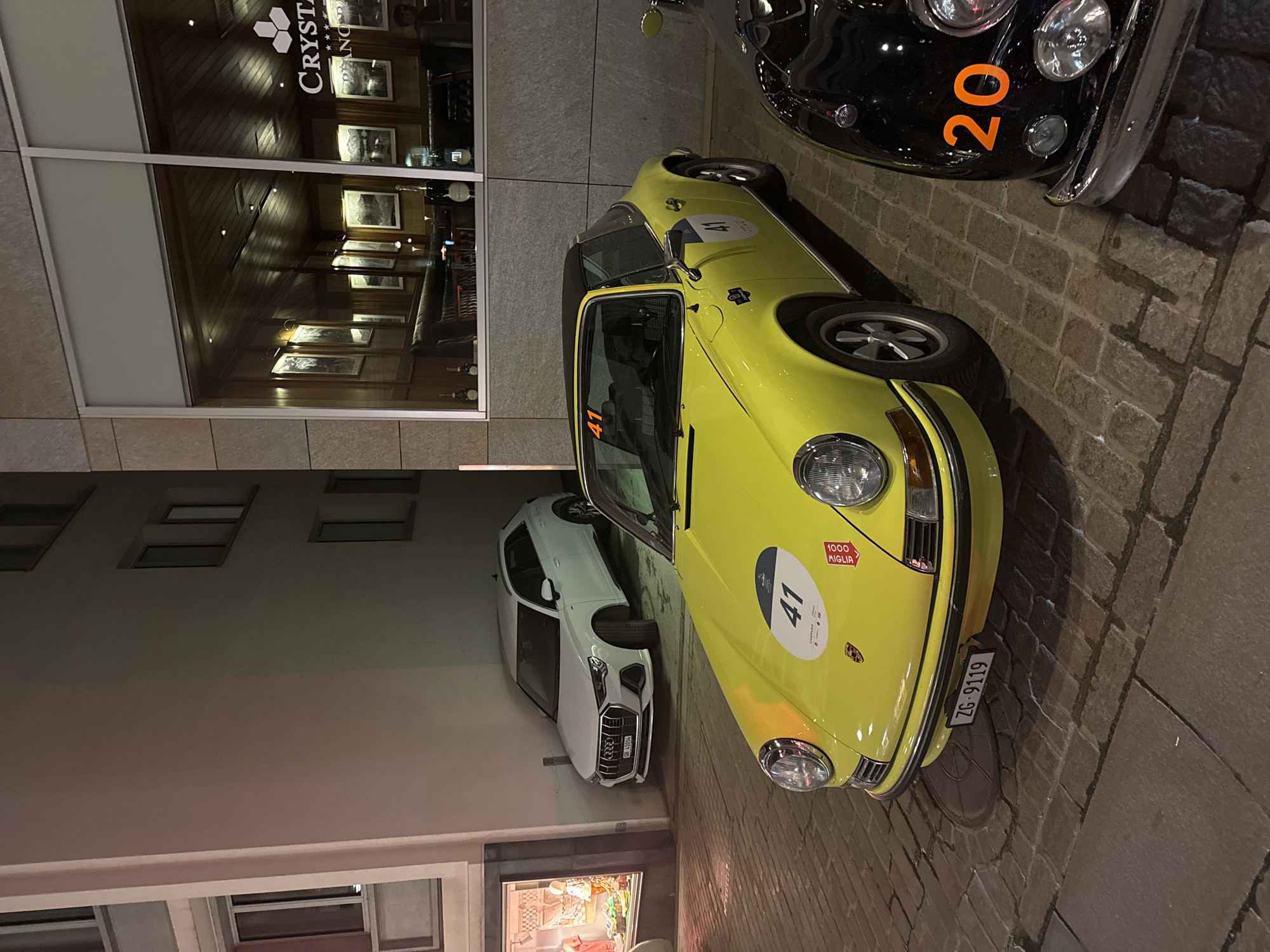 The scene depicts an outdoor urban environment at night in Sankt Moritz, Switzerland, with several vehicles parked on a cobblestone surface. In the foreground, a bright yellow classic Porsche 911 Targa is prominently featured, facing forward. It displays rally number "41" on its hood, windshield, and driver's side door, alongside "Chopard" and "1000 MIGLIA" event decals. The vehicle's Swiss license plate is "ZG-9119". To the immediate right of the Porsche, the front portion of a black classic car with an orange rally number "20" on its fender is partially visible. Further in the background, to the left of the yellow Porsche, a white Audi Q3 SUV with Swiss license plate "GR-51014" is parked within a building alcove next to a ground-level retail display window containing mannequins. The building on the right features a large window revealing the interior of the "CRYSTAL PIANO BAR," identified by visible signage. This interior is richly appointed with dark wood paneling on walls and ceiling, recessed lighting, framed artworks, and dark leather seating. Bottles, possibly champagne, are visible on a surface near the window, and a faint human silhouette can be discerned deeper within the bar. The cobblestone pavement exhibits wet reflections in several areas.