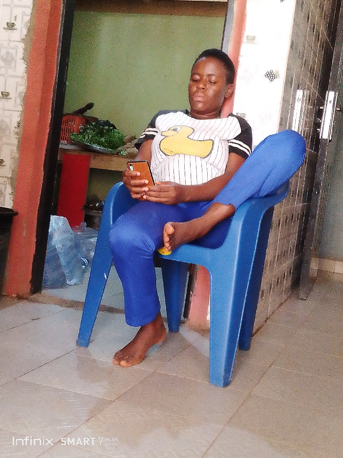 In an indoor setting in Akokwa, Nigeria, a single individual is seated in a blue plastic chair. The individual, identified as an adult female, has short dark hair and dark skin. She is wearing a white t-shirt with thin black vertical stripes and a large yellow duck graphic on the chest, along with black sleeves featuring two white horizontal stripes. She wears blue leggings and is barefoot. She holds a brown-cased smartphone in both hands, looking down at the screen. Her left leg is crossed over her right, with her left foot resting on her right thigh. Her right foot is flat on the light-colored tiled floor. To the individual's left, a doorway with a reddish-brown frame leads to another room with a light green wall. Within this adjacent room, a wooden surface holds a brown basket filled with green leafy vegetables, a red object, and a silver pot. To the individual's right, a dark door with a patterned surface and silver handles is visible. The bottom left of the image contains a watermark reading "Infinix SMART 7 PLUS".
