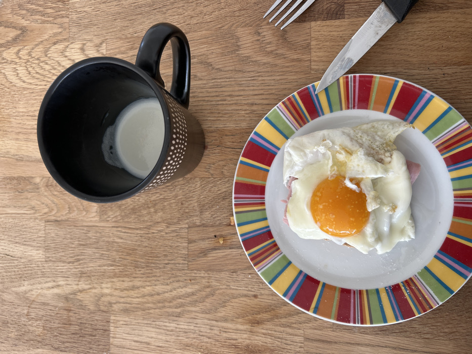 The image depicts a static indoor scene on a light-brown wooden surface, likely a table, lacking verifiable information to place it in Veauchette, France. In the upper right quadrant, a black ceramic mug with a white dotted pattern around its lower exterior contains a small amount of white liquid with some foam, consistent with milk. In the lower left quadrant, a white circular plate with a multi-colored striped rim (featuring red, orange, yellow, green, blue, and purple stripes) holds a prepared food item. This item consists of a base, possibly bread, topped with slices of pink processed meat, likely ham, and a single fried egg with a bright, intact orange yolk and solidified white. To the right of the plate, a silver-colored knife with a black handle rests on the table, partially overlapping the plate's rim. Above the knife, the prongs of a silver-colored fork are partially visible. Small dark crumbs are scattered on the wooden surface near the plate. No individuals are present.