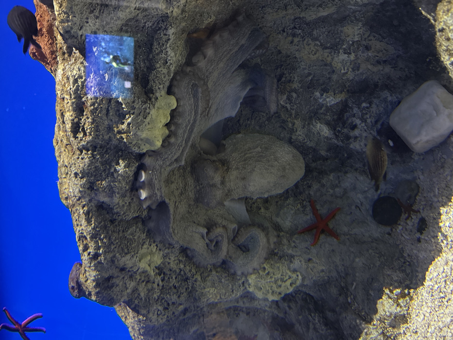 This image depicts an underwater exhibit at the Acquario di Genova in Genoa, Italy. A large, light gray-brown octopus is centrally positioned, partially camouflaged within textured artificial rock formations, with its two prominent eyes visible peering from behind an overhang. A bright red, five-armed starfish rests on the sandy substrate in the lower-left, while a fragment of a purple starfish is visible in the upper-left corner. A dark-bodied fish perches on a reddish rock formation in the upper-right, and a striped fish swims horizontally near the lower-center. A small, dark, circular invertebrate lies on the sand below the red starfish. The background is a vibrant, uniform blue, and a rectangular reflection of a person in a wetsuit is present on the upper-right glass panel. The environment consists of varied gray and brown artificial rock structures, some featuring yellowish coral-like growths, over a sandy bottom with scattered pebbles.