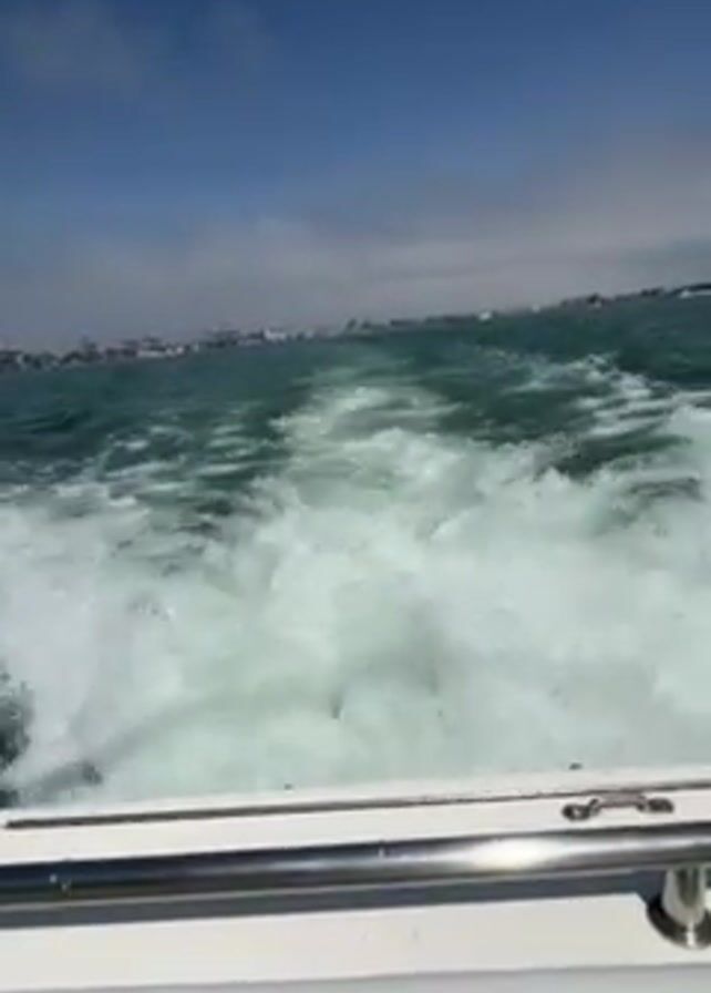 wake of a boat moving through green water. In the distance, a city shoreline is visible under a blue sky with some clouds. The footage is shot from the stern of the boat, with the stainless steel railing visible in the foreground.