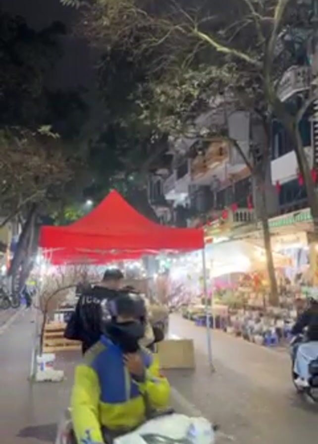 street scene at night. A couple stands on the street looking at something in front of a red tent. There are several motorbikes traveling on the street. There are buildings on the right side of the street, some decorated with what appear to be red lanterns. Bare trees are visible overhead. The street appears to be set up with displays, possibly for selling flowers.