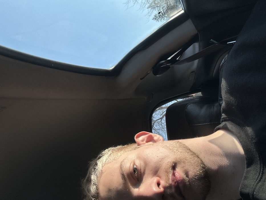 The image displays a young adult male positioned in the front passenger seat of a vehicle, captured from a slightly low and angled perspective