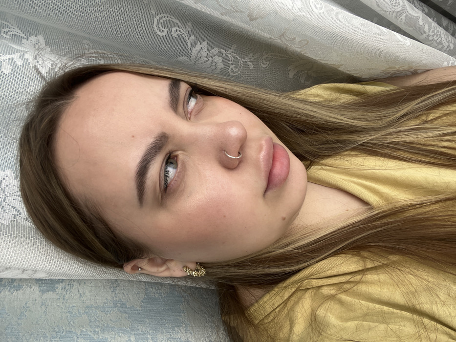 The image depicts a close-up, chest-up view of a young adult female in an indoor setting. She has light brown hair, light-colored eyes, and fair skin, with a slightly pensive expression, looking towards the right side of the frame. Her lips are slightly parted. She is wearing a mustard yellow V-neck top. Her visible left ear features a small stud piercing in the upper cartilage and a gold-colored, textured hoop earring in the lobe. A silver-colored hoop piercing is visible in her left nostril. The background consists of two distinct curtains: a light blue patterned fabric on the left and a white lace curtain with a floral design on the right. There are no specific environmental details visible to identify a precise location within the city of Chaikovsky, Russia; the scene appears to be a typical domestic interior.