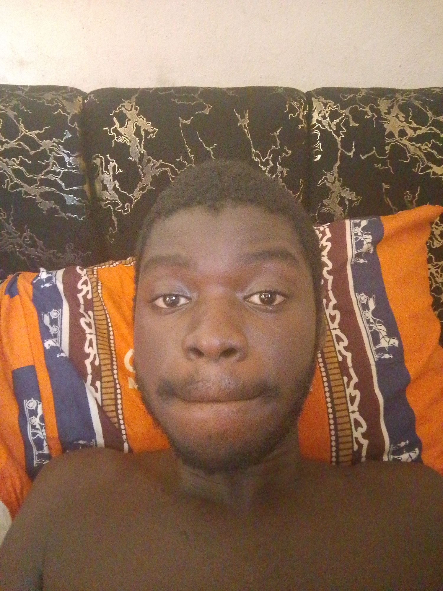 An individual with dark skin and short, dark hair is depicted in a close-up, head-and-shoulders frame. The subject appears male, lying supine, directly facing the camera with eyes open and a slightly pursed mouth. Minimal facial hair is visible around the chin and jawline. The upper chest is bare. The head rests on an orange pillow patterned with blue and brown stripes, featuring white motifs resembling horse-drawn carriages. Behind the pillow, a dark black fabric surface, possibly a sofa back or headboard, exhibits a metallic gold or silver dendritic pattern. Above this fabric, a plain, light-colored wall is visible. The scene is an indoor setting within Ukukwa, Nigeria.