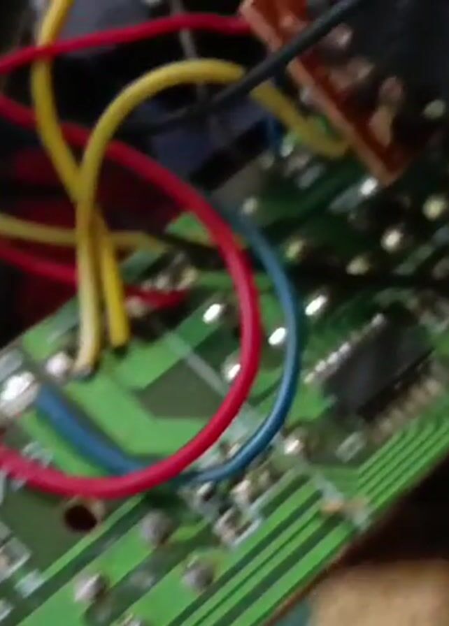 close-up of a green circuit board with several components attached to it. There are various colored wires, including red, blue, yellow, and white, connecting the components. Some of the components include switches, potentiometers, and an integrated circuit. A red LED is also visible. The background is blurry and indistinct.
