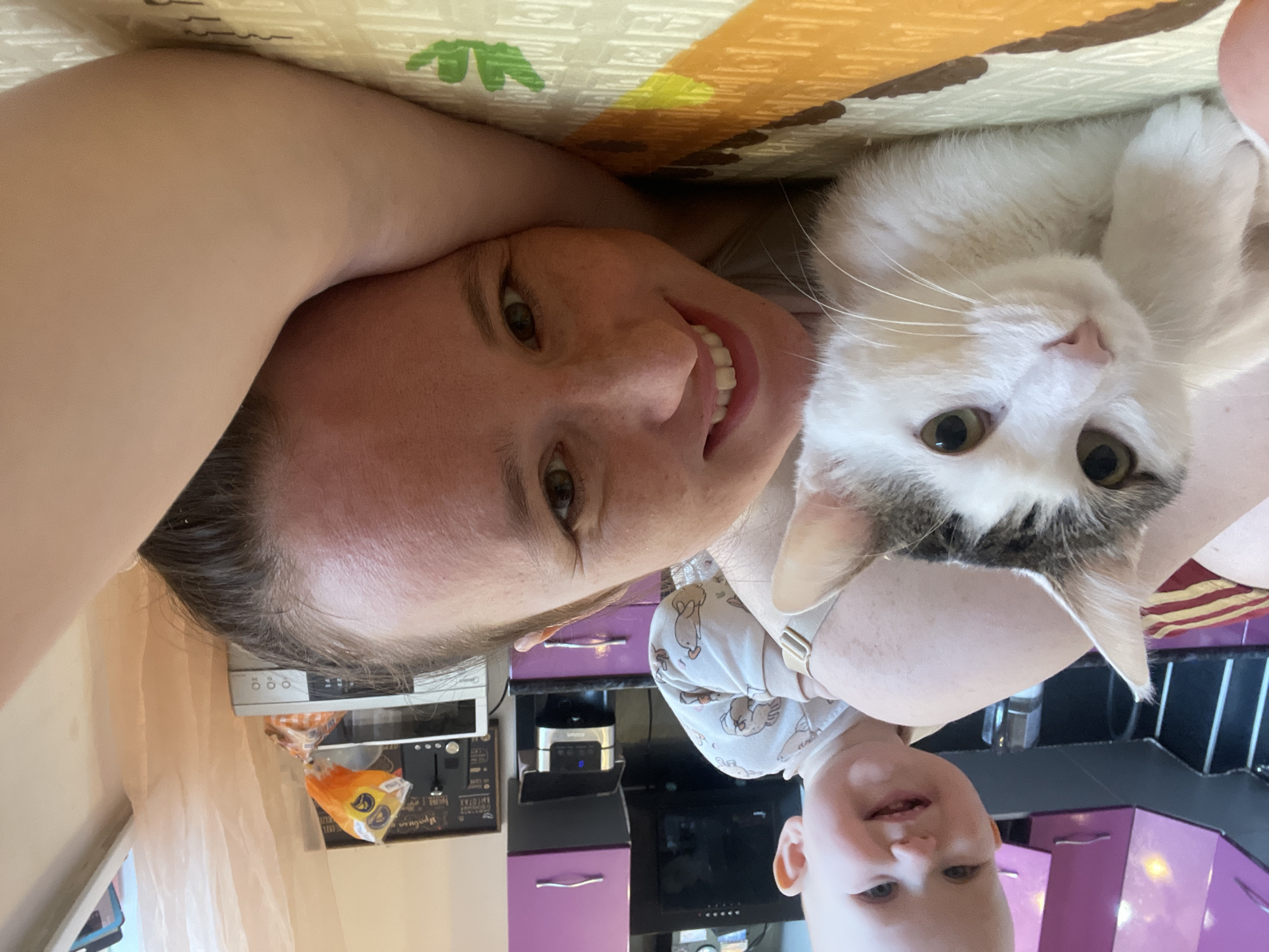 The image displays an indoor domestic scene in Podstepki, Russia, featuring an adult female, an infant, and a domestic cat. The adult female is positioned in the foreground, lying prone on a light-colored mat with yellow, brown, and green abstract patterns. She has brown hair, green/hazel eyes, and is smiling directly towards the camera, with her head resting on her right arm. An infant with light skin and very light, short hair is visible behind the female's torso, also smiling broadly towards the camera. The infant is wearing a light-colored long-sleeved onesie adorned with cartoon animal patterns. A domestic cat, predominantly white with brown and grey tabby markings on its head and tail, rests in front of the female's upper body, facing slightly left of the camera. It possesses green/hazel eyes and a pink nose. The background reveals a kitchen area equipped with purple overhead cabinets and a dark countertop. Visible appliances include a black coffee maker with a blue indicator light, a silver microwave oven, and a white toaster. A black framed board with white text is mounted on the wall, and orange plastic bags are situated on the counter. A window with light sheer curtains is visible on the right side of the frame.
