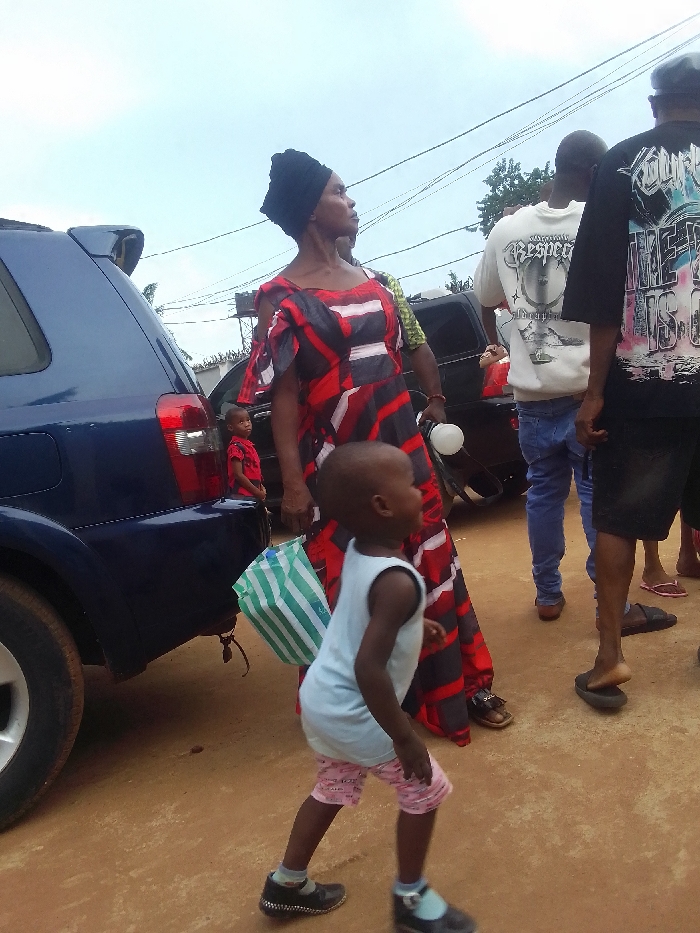 In Ukwu-Abwa, Nigeria, an outdoor scene shows several people standing on a dusty surface. A woman in a red and black patterned dress and head covering stands near a dark blue SUV. A young child wearing a light blue top and patterned shorts walks in the foreground. Several other adults are visible, one wearing a white t-shirt and another a black t-shirt with graphic designs. An additional child is visible near the SUV. Power lines stretch overhead.
