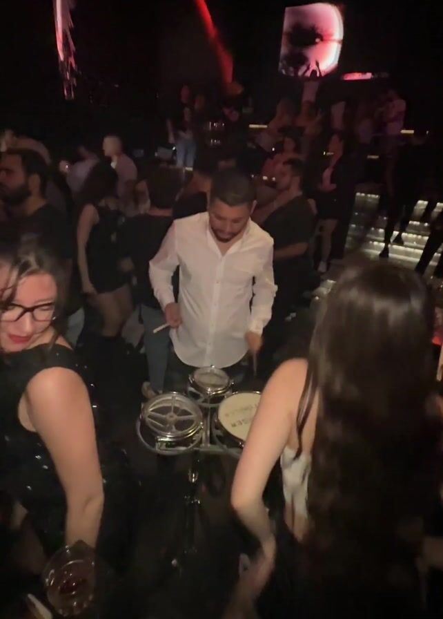 crowded nightclub. In the center, a man in a white shirt plays a small drum kit. Two women dance on either side of him, one in a black dress and glasses, the other in a white top with long dark hair. Other people in the club are dancing and socializing, and black balloons float in the air. Large video screens display abstract images. The lighting is dark with red accents.