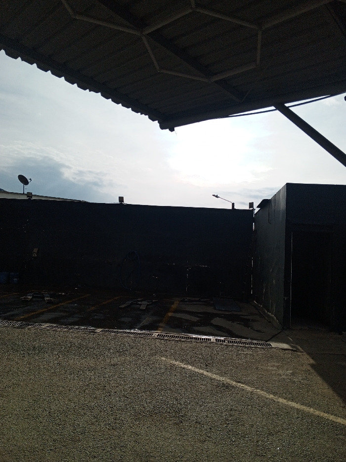 A shadowed outdoor area is dominated by a dark, high wall and a building with a visible doorway. A satellite dish is mounted on a rooftop visible above the wall. Overhead, a geometric canopy casts shadows. The ground is mostly paved, showing some standing water. A drainage grate is visible between the paved surface and the wall. The sky is bright with some clouds.