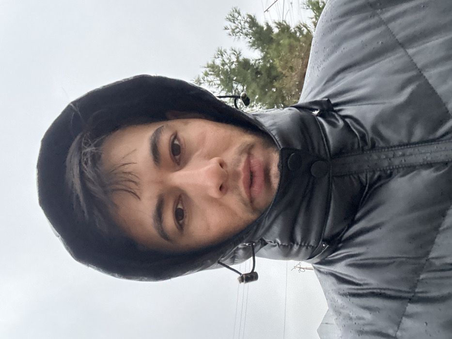 A male individual is depicted in a close-up, head-on shot, standing outdoors in Yangiiul, Uzbekistan. He has short, dark hair and is wearing a black, possibly wet or shiny, hooded puffer jacket. The jacket's hood is up, covering his head, and features visible drawstrings with black toggles. Small water droplets are present on the surface of the jacket, indicating a damp environment. His facial expression is neutral, and he looks directly into the camera. The background consists of an overcast, light gray sky. To the right, a portion of a green coniferous tree is visible. To the left, indistinct light-colored structures and thin utility wires are discernible in the distance.