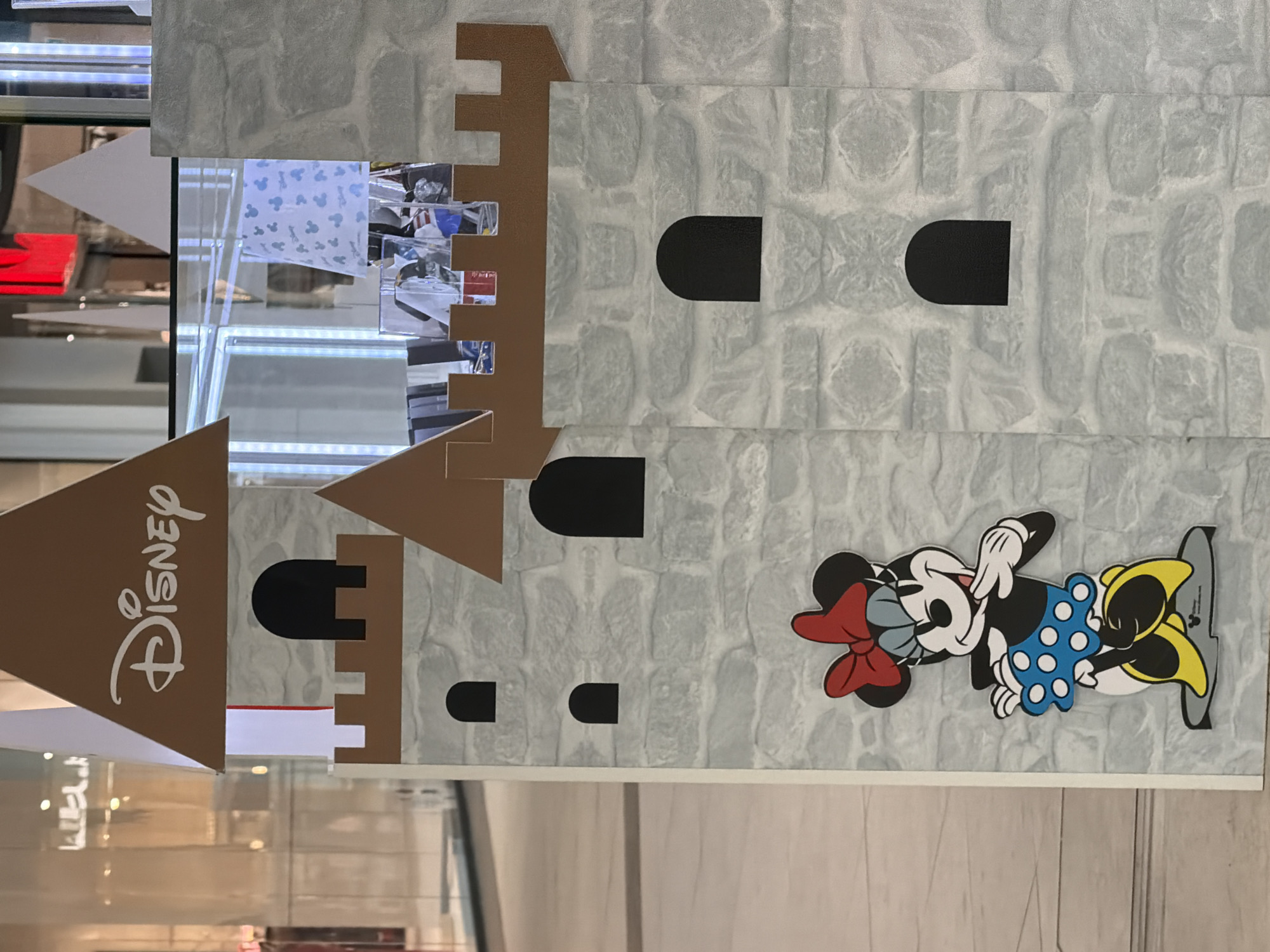 Disney-themed display. It is designed to resemble a castle wall, with gray stone-patterned background and brown castle turrets. There are black arched windows along the wall. Minnie Mouse is illustrated in the bottom right, wearing a red bow and blue polka-dot dress. The Disney logo is vertically displayed on a brown structure. The background shows a modern retail environment, suggesting the display is in a shopping mall or store. The location is Unknown, Unknown.