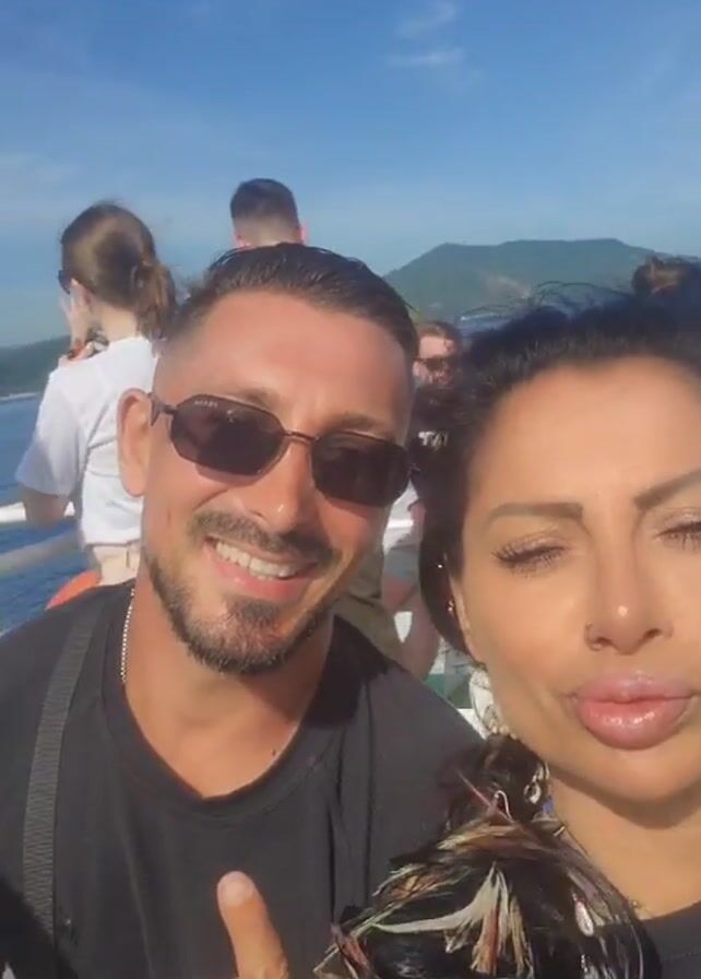 man and a woman taking a selfie on a boat, with other passengers visible in the background. The man is wearing sunglasses and a black shirt, smiling and pointing to the side with his left hand. The woman is also wearing a black shirt, with dark hair and a nose ring. They are both looking into the camera. The background includes the ocean, other people on the boat, and land visible in the distance under a blue sky with some clouds. Music is audible in the background.