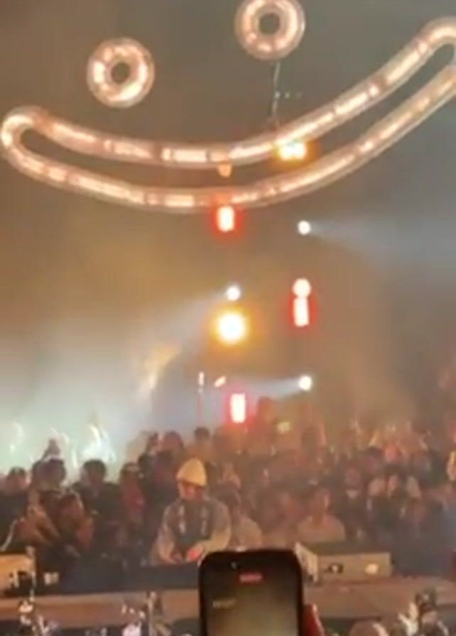 crowded concert venue. The focus shifts between the stage and the crowd. The stage is adorned with a large illuminated smiley face, accompanied by lighting effects. A performer in a beige beanie and gray jacket is visible on stage in front of DJ equipment. The crowd is full of people recording the event on their phones. Some people have drinks in their hands. The lighting alternates between bright white and red hues.