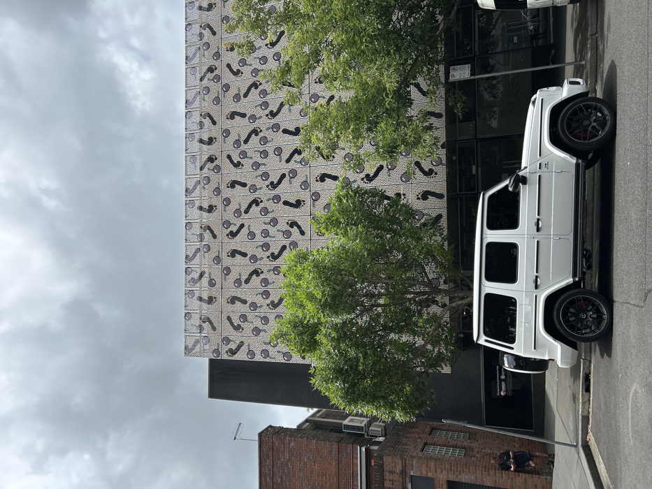 A white Mercedes-Benz G-Wagon is parked on a city street beside a building. The building has a patterned facade with a design of footprints and magnifying glasses. Trees partially obscure the car and building. The sky is overcast. A red brick building and a person are visible in the background.
