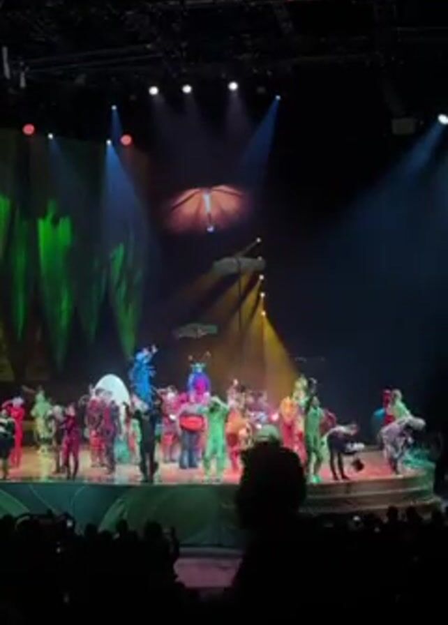 A stage show is in progress, concluding with a large cast taking a bow. The performers are dressed in colorful, fantastical costumes. The stage backdrop features green and shadowy imagery, with suspended decorative elements. The stage is illuminated by spotlights of varying colors. An audience is visible in the foreground, their faces obscured in shadow, as they applaud.