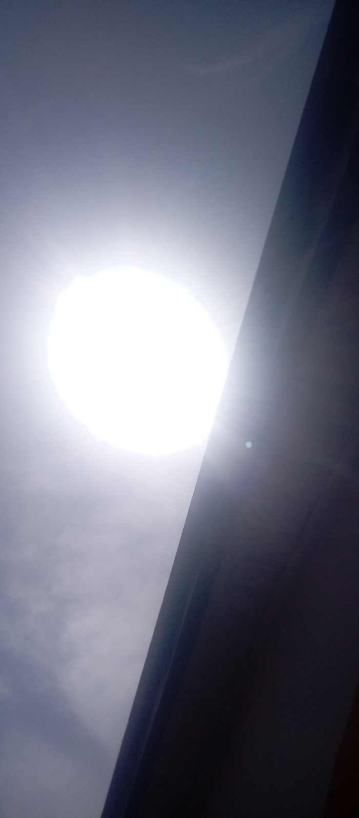 The image captures a celestial body, most likely the sun, as a bright, circular glare in a hazy sky. A dark, angular shape intersects the frame diagonally, possibly a building's edge or roofline. The sky fades from a brighter white near the sun to a muted gray, suggesting cloud cover or atmospheric haze. The sharp contrast between the bright light and dark structure creates a stark visual division. A bright dot of light, possibly a lens flare, appears on the dark shape.